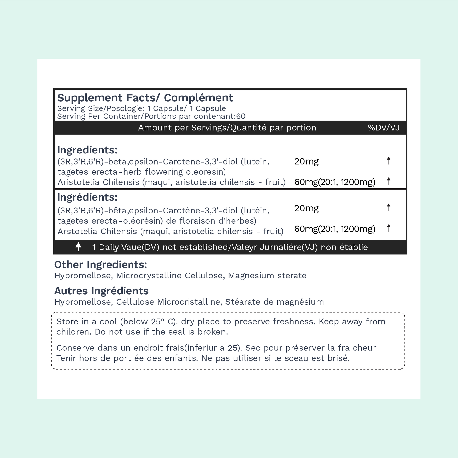 Our Eyecare supplement is a clinically formulated blend that supports optimal eye health. It is enriched with maqui berry extract and lutein, providing nourishment to retain eyesight. This supplement works best for adults who have to deal with age-related macular degeneration.